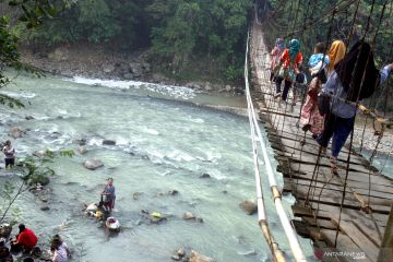 Warga menyeberangi jembatan gantung Kantalarang yang rusak di perbatasan Kecamatan Rumpin dan Leuwiliang, Kabupaten Bogor, Jawa Barat, Senin (15/7/2019). Jembatan gantung penghubung antar Kecamatan itu sudah mulai rusak dan lapuk sehingga dapat membahayakan warga yang menyeberang. ANTARA FOTO/Yulius Satria Wijaya/hp.