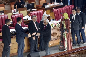 Wakil Ketua DPR Agus Hermanto (keempat kiri) menyalami calon anggota Komisi Penyiaran Indonesia (KPI) Pusat Periode 2019-2022 saat Rapat Paripurna DPR di Kompleks Parlemen, Senayan, Jakarta, Selasa (16/7/2019). Rapat Paripurna tersebut beragendakan Laporan Komisi I DPR RI terhadap uji kepatuttan dan kelayakan terhadap calon anggota periode 2019-2022. ANTARA FOTO/M Risyal Hidayat/ama.