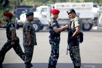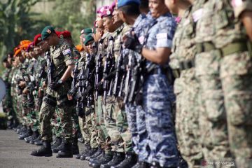 Tentara Nasional Indonesia (TNI) dan Angkatan Tentera Malaysia (ATM) mengikuti upacara pembukaan Latgabma Malindo Darsasa-10AB/2019 di lapangan latihan Pusat Misi Pemeliharaan Perdamaian TNI (PMPP TNI), Sentul, Bogor, Jawa Barat, Jumat (19/7/2019). Latgabma Malindo Darsasa merupakan kegiatan kerja sama bilateral berupa latihan operasi yang diikuti oleh 234 personel TNI dan 136 personel ATM, latihan ini merupakan latihan gabungan tiga tahunan yang sebelumnya Latgabma Malindo Darsasa-9AB/2016 diselenggarakan di Kuantan, Malaysia. ANTARA FOTO/Yulius Satria Wijaya/wsj.