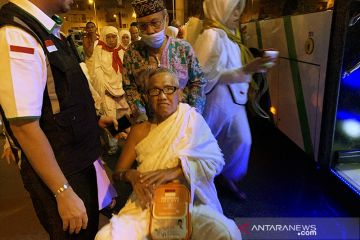 Sejumlah petugas siaga mendampingi jamaah, termasuk mendorong kursi roda bagi calon haji lanjut usia (lansia) yang membutuhkan pertolongan, Mekkah, Arab Saudi, Senin malam menjelang Selasa dinihari (22/7/2019). Calon haji lansia mendominasi yang jumlahnya mencapai 63 persen dari total 231.000 jamaah asal Indonesia. ANTARA/Hanni Sofia/aa