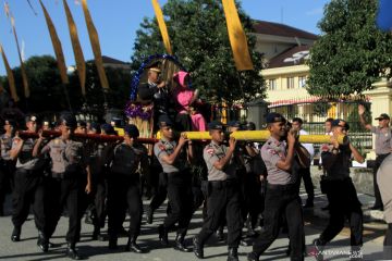 Sebanyak 13 personel Polri berpangkat bintara dan perwira yang telah Purna Bhakti diarak dengan adat Kansodaa khas Wakatobi berkeliling di Polda Sultra, Kendari, Sulawesi Tenggara, Selasa (23/7/2019). Upacara wisuda Purna Bhakti di Polda Sulawesi Tenggara tersebut dilaksanakan sebagai wujud terimakasih atas pengabdiannya menjadi polisi selama puluhan tahun. ANTARA FOTO/Jojon/hp.