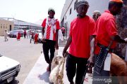 Petugas membawa hewan kurban/dam ke pusat penyembelihan dan pemotongan daging di Pasar Anam di Kilo Asyaro, Mekkah Selasa (23/7/2019). Pasar Anam biasanya ramai didatangi jamaah saat musim haji sebagai tempat alternatif untuk membayar dam, pasar ini banyak didatangi kaum dhuafa yang berharap mendapatkan bagian rezeki termasuk daging hewan dam dari jemaah. ANTARA/Hanni Sofia/pri
