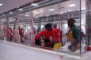 Pekerja menyembelih kambing di pusat penyembelihan dan pemotongan daging di di Pasar Anam di Kilo Asyaro, Mekkah Selasa (23/7/2019). Pasar Anam biasanya ramai didatangi jamaah saat musim haji sebagai tempat alternatif untuk membayar dam, pasar ini banyak didatangi kaum dhuafa yang berharap mendapatkan bagian rezeki termasuk daging hewan dam dari jemaah. ANTARA/Hanni Sofia/pri