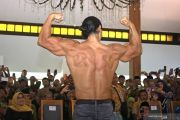 Duta BPJS Kesehatan Ade Rai menunjukkan otot tubuhnya saat memberikan sosialisasi hidup sehat kepada Forum Pimpinan Daerah dan Tokoh Agama di Pendopo. Banyuwangi, Jawa Timur, Kamis (25/7/2019). Melalui sosialisasi tersebut, diharapkan dapat meningkatkan pemahaman bagi masyarakat melalui tokoh agama dan tokoh masyarakat tentang program JKN-KIS pada setiap kegiatan-kegiatan kemasyarakatan atau keagamaan. ANTARA FOTO/Budi Candra Setya/wsj.