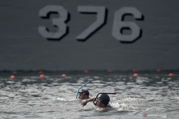 Sejumlah peserta memacu kecepatannya dalam lomba renang 6.000 meter Putra Fin Swimming di Kompleks Satuan Koarmada I Pondok Dayung, Tanjung Priok, Jakarta, Sabtu (27/7/2019). Kegiatan tersebut merupakan rangkaian dari "Navy Open Water Sport (NOWS) Tournament 2019" yang mempertandingkan beberapa cabang olahraga perairan yaitu Dayung, Layar, Ski Air, Selam dan Jet Ski dan diikuti sedikitnya 1.420 orang peserta baik TNI-Polri maupun umum. ANTARA FOTO/M Risyal Hidayat/wsj.