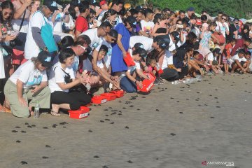 Warga dan wisatawan melepas Tukik Penyu Lekang (Lepidochelys olivacea) saat rangkaian kegiatan Bali's Big Eco Weekend 2019 di Pantai Seminyak, Badung, Bali, Sabtu (27/7/2019). Festival tahunan tersebut mengadakan berbagai kegiatan peduli lingkungan pantai seperti pelepasan Tukik (bayi Penyu) dan aksi bersih pantai. ANTARA FOTO/Fikri Yusuf/hp.