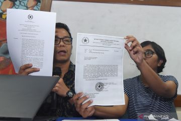 Kepala Advokasi Lembaga Bantuan Hukum (LBH) Jakarta Nelson Nikodemus Simamora (kiri) bersama Ketua Umum Yayasan Lembaga Bantuan Hukum Indonesia (YLBHI) Asfinawati (kanan) menunjukkan surat penolakan pemberian informasi terkait salinan Kepres Pembentukan Pansel Capim KPK dari Kemen Setneg dalam konferensi pers menyoroti kinerja Pansel Capim KPK di gedung LBH Jakarta, Menteng, Jakarta, Minggu (28/7/2019). Dalam konferensi pers itu Koalisi Masyarakat Sipil (LBH Jakarta, ICW, YLBHI, dan PUSaKO FH Unand) memperoleh temuan Keppres Pansel tidak dapat diakses publik, Pansel meluluskan figur-figur yang tidak terbuka terhadap laporan kekayaan, serta meluluskan figur yang berpotensi melanggar etik di KPK. ANTARA FOTO/Indrianto Eko Suwarso/aww.