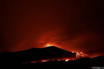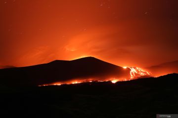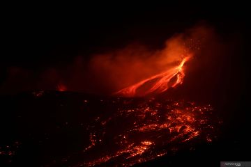 Gunung Etna yang merupakan gunung berapi paling aktif dan tertinggi di Eropa mengeluarkan lava saat erupsi di Sicily, Italia, Sabtu (27/7/2019). ANTARA FOTO/REUTERS/Antonio Parrinello/pras.