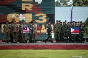 Personel Batalyon Infantri Raider 613 Raja Alam menunjukkan senjata pistol jenis G2 Combat Kal. 9 mm kepada prajurit Tentera Darat Malaysia usai upacara pembukaan Latihan bersama Indomalphi Land Exercise 2019 dilapangan Batalyon Infantri Raider 613 Raja Alam, Tarakan, Kalimantan Utara, Senin (29/7/2019). Latihan bersama Indomalphi Land Exercise 2019 yang diikuti tiga negara yakni Indonesia, Malaysia dan Filipina tersebut bertujuan menjaga keamanan wilayah dari ancaman teroris di tiga negara tersebut terutama di wilayah perbatasan. ANTARA FOTO/Fachrurrozi/zk/hp.