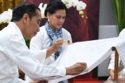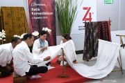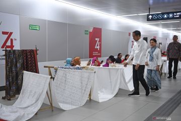 Presiden Joko Widodo (ketiga kanan) didampingi Ibu Negara Iriana Joko Widodo (kedua kanan) menyaksikan pembatik menyelesaikan pembuatan batik motif Gurdo sepanjang 74 meter saat menghadiri kegiatan Batik Kemerdekaan di Stasiun MRT Bundaran HI Jakarta, Kamis (1/8/2019). Kegiatan Batik Kemerdekaan diikuti 74 pembatik dari berbagai sentra kerajinan batik tersebut meruapakan rangkaian perayaan HUT ke-74 RI. ANTARA FOTO/Wahyu Putro A/hp.
