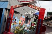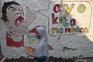 Seorang bocah berjalan melintas di depan lukisan dinding di Kampung Literasi RW 08, Jatipulo, Palmerah, Jakarta Barat, Jumat (2/8/2019). Kelurahan bersama warga setempat menjadikan kampung padat penduduk Jatipulo sebagai pusat kampanye literasi dengan menyediakan tiga titik lokasi peminjaman buku gratis serta sejumlah lukisan dinding berisi ajakan gemar membaca. ANTARA FOTO/Aditya Pradana Putra/hp.