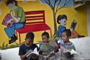 Sejumlah bocah membaca buku yang dipinjamkan secara gratis di Kampung Literasi RW 08, Jatipulo, Palmerah, Jakarta Barat, Jumat (2/8/2019). Kelurahan bersama warga setempat menjadikan kampung padat penduduk Jatipulo sebagai pusat kampanye literasi dengan menyediakan tiga titik lokasi peminjaman buku gratis serta sejumlah lukisan dinding berisi ajakan gemar membaca. ANTARA FOTO/Aditya Pradana Putra/hp.