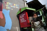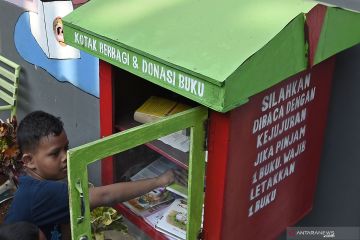 Seorang bocah memilih buku yang dipinjamkan secara gratis di Kampung Literasi RW 08, Jatipulo, Palmerah, Jakarta Barat, Jumat (2/8/2019). Kelurahan bersama warga setempat menjadikan kampung padat penduduk Jatipulo sebagai pusat kampanye literasi dengan menyediakan tiga titik lokasi peminjaman buku gratis serta sejumlah lukisan dinding berisi ajakan gemar membaca. ANTARA FOTO/Aditya Pradana Putra/hp.