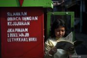 Seorang bocah membaca buku yang dipinjamkan secara gratis di Kampung Literasi RW 08, Jatipulo, Palmerah, Jakarta Barat, Jumat (2/8/2019). Kelurahan bersama warga setempat menjadikan kampung padat penduduk Jatipulo sebagai pusat kampanye literasi dengan menyediakan tiga titik lokasi peminjaman buku gratis serta sejumlah lukisan dinding berisi ajakan gemar membaca. ANTARA FOTO/Aditya Pradana Putra/hp.