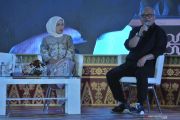 Perancang Busana Muslim ternama Itang Yunasz (kanan) dan pemilik brand Button Scarves Linda Anggreaningsih (kiri) menjadi pembicara pada Talkshow bertema Peluang Bisnis Fashion Muslim sebagai rangkaian Festival Ekonomi Syariah (FESyar) di Palembang, Sumatera Selatan, Jumat (2/8/2019). Kedua pelaku usaha bidang fesyen muslim tersebut berbagi tips dan pengalaman kepada para ibu dan pelaku usaha di Kota Palembang. ANTARA FOTO/Feny Selly/hp.