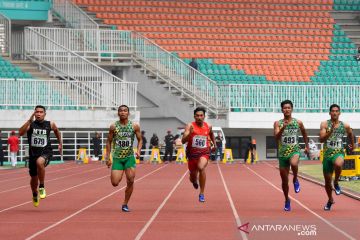 Sejumlah pelari beradu cepat dalam nomor lari 100 meter final putra Kejuaraan Nasional Atletik U-18, U-20 dan Senior 2019 di Stadion Pakansari, Bogor, Jawa Barat, Jumat (2/8/2019). Sudirman Hadi asal NTB berhasil menempati urutan pertama medali emas dengan catatan waktu 10,58 detik, urutan kedua medali perak ditempati M.Bisma Dewa Abin asal Jawa Timur dengen catatan waktu 10,581 detik dan posisi ketiga medali perunggu diraih Eko Rimbawan asal Kalimantan Tengah dennen catatan waktu 10,584 detik. ANTARA FOTO/M Risyal Hidayat/hp.
