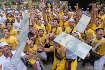 Umat Hindu saling berebut menangkap uang yang dilemparkan warga dalam tradisi Mesuryak di Desa Bongan Gede, Tabanan, Bali, Sabtu (3/8/2019). Tradisi Mesuryak digelar setiap Hari Raya Kuningan untuk beramal sekaligus memberikan bekal dan mengantarkan roh para leluhur kembali ke Sang Pencipta dengan rasa suka cita. ANTARA FOTO/Nyoman Hendra Wibowo/nym/ama.