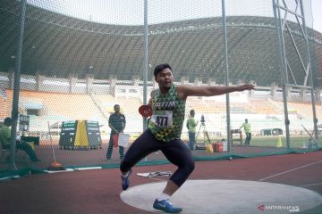 Atlet Maulana Dimas asal Jawa Timur melakukan lemparan pada final lempar akram U-18 Kejuaraan Nasional Atletik 2019 di Stadion Pakansari, Cibinong, Bogor, Jawa Barat, Rabu (7/8/2019). Maulana Dimas meraih medali emas dengan jarak lemparan 45,24 meter, disusul Najib Kurnia atlet asal Jawa Tengah meraih medali perak dengan jarak lemparan 42,75 meter, dan Rizky Aditya Nugraha asal Jambi meraih medali perunggu dengan jarak lemparan 37,14 meter. ANTARA FOTO/Yulius Satria Wijaya/hp.