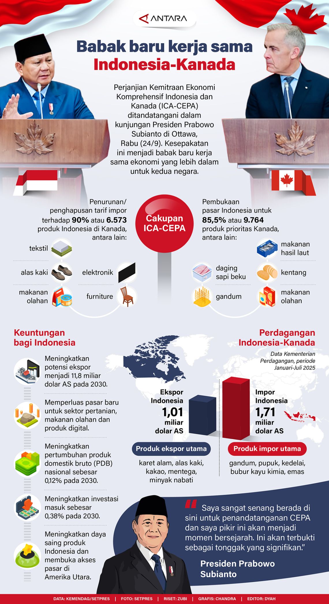 Perjanjian Kemitraan Ekonomi Komprehensif Indonesia dan Kanada (ICA-CEPA) ditandatangani dalam kunjungan Presiden Prabowo Subianto di Ottawa, Rabu (24/9). Kesepakatan ini menjadi babak baru kerja sama ekonomi yang lebih dalam untuk kedua negara.