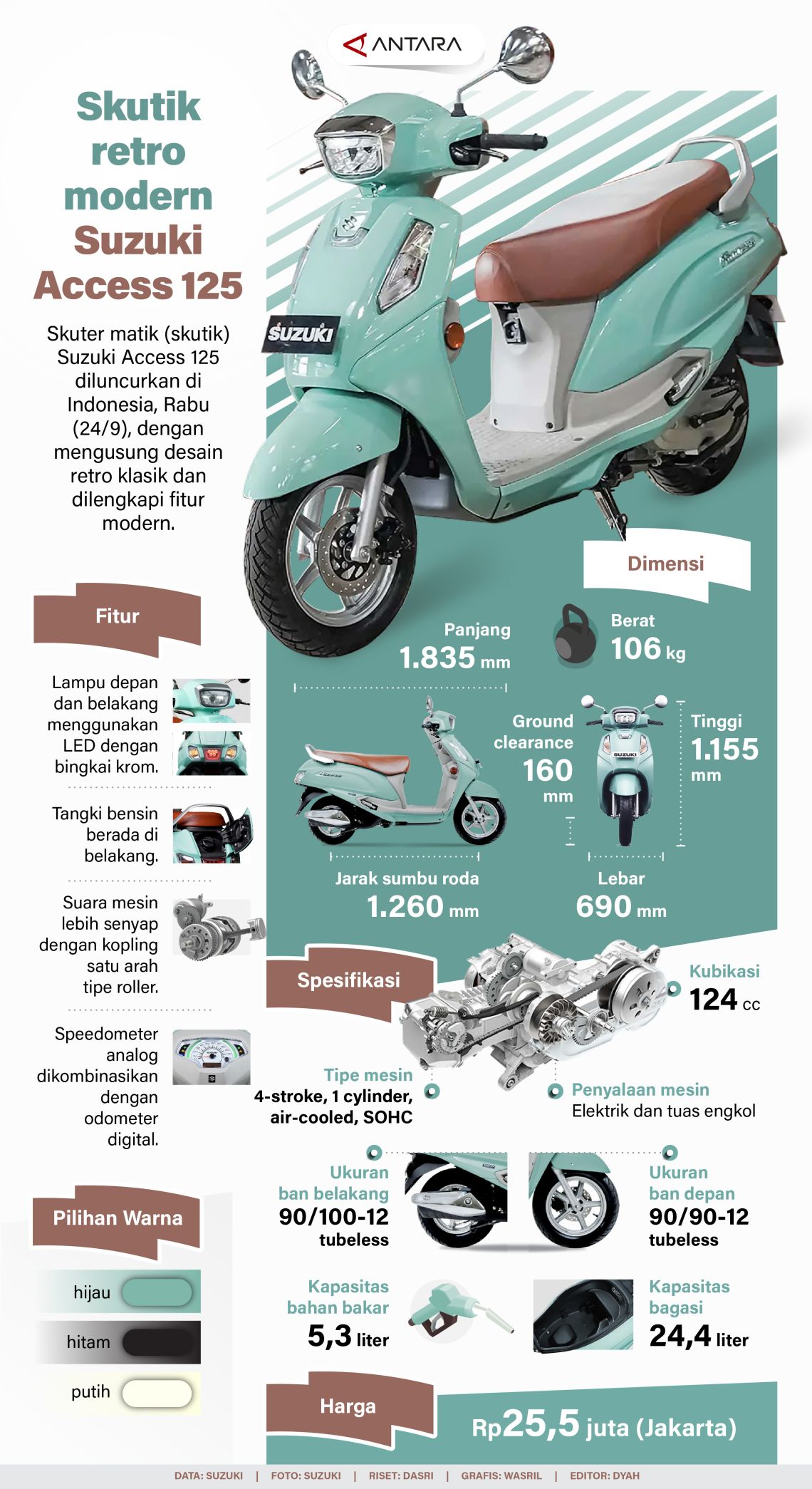 Skuter matik (skutik) Suzuki Access 125 diluncurkan di Indonesia, Rabu (24/9), dengan mengusung desain retro klasik dan dilengkapi fitur modern.