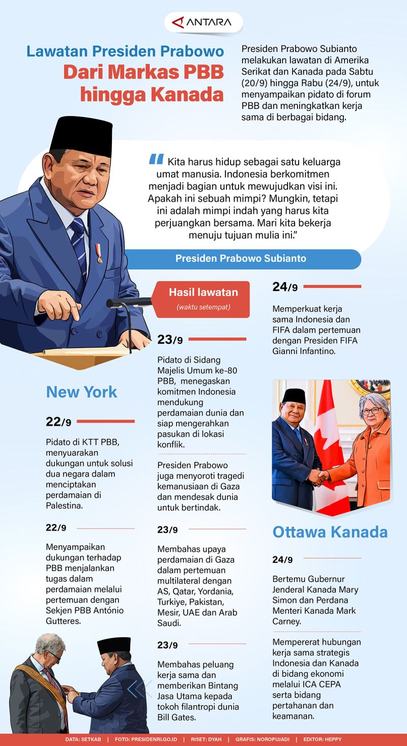 Presiden Prabowo Subianto melakukan lawatan di Amerika Serikat dan Kanada pada Sabtu (20/9) hingga Rabu (24/9), untuk menyampaikan pidato di forum PBB dan meningkatkan kerja sama di berbagai bidang.