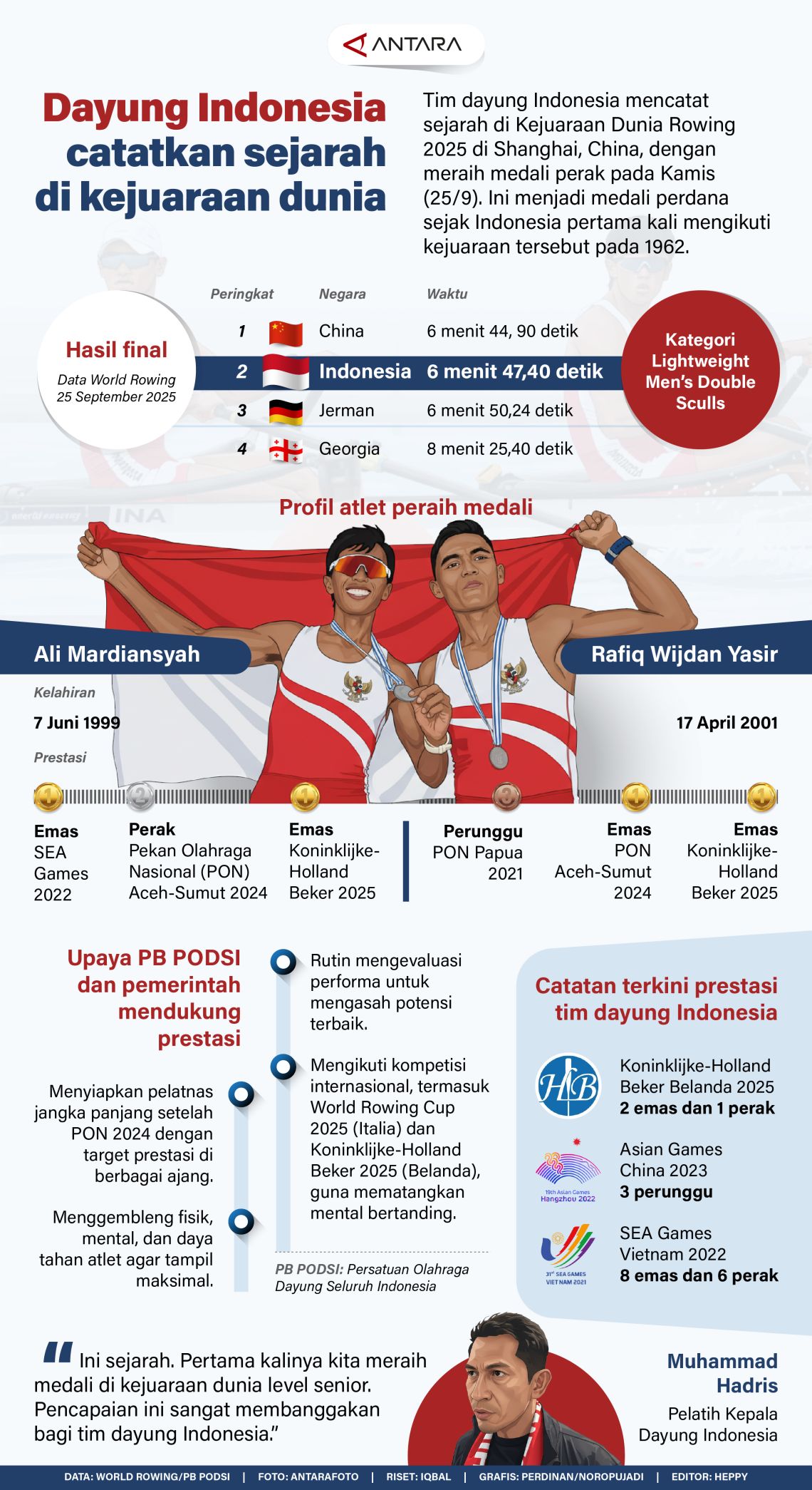 Tim dayung Indonesia mencatat sejarah di Kejuaraan Dunia Rowing 2025 di Shanghai, China, dengan meraih medali perak pada Kamis (25/9). Ini menjadi medali perdana sejak Indonesia pertama kali mengikuti kejuaraan tersebut pada 1962.