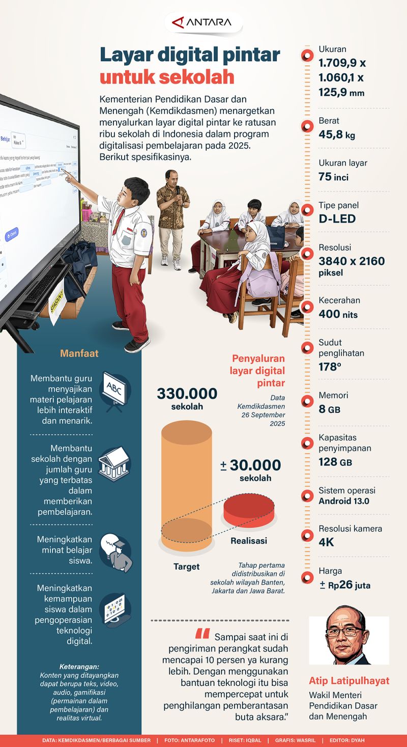 Kementerian Pendidikan Dasar dan Menengah (Kemdikdasmen) menyalurkan layar digital pintar ke ratusan ribu sekolah di Indonesia dalam program digitalisasi pembelajaran pada 2025. Berikut spesifikasinya.