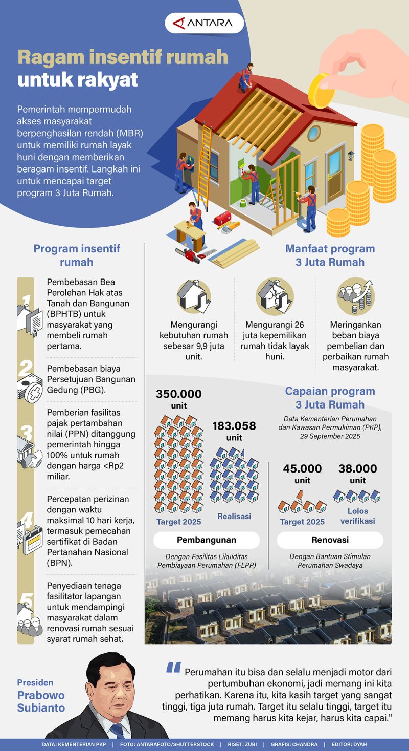 Pemerintah mempermudah akses masyarakat berpenghasilan rendah (MBR) untuk memiliki rumah layak huni dengan memberikan beragam insentif. Langkah ini untuk mencapai target program 3 Juta Rumah.
