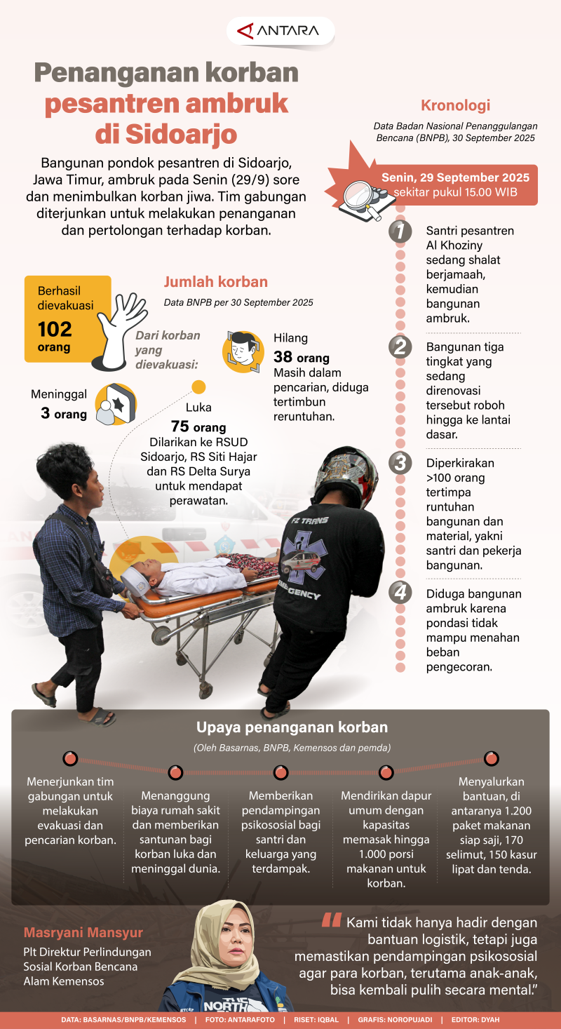 Bangunan pondok pesantren di Sidoarjo, Jawa Timur, ambruk pada Senin (29/9) sore dan menimbulkan korban jiwa. Tim gabungan diterjunkan untuk melakukan penanganan dan pertolongan terhadap korban.