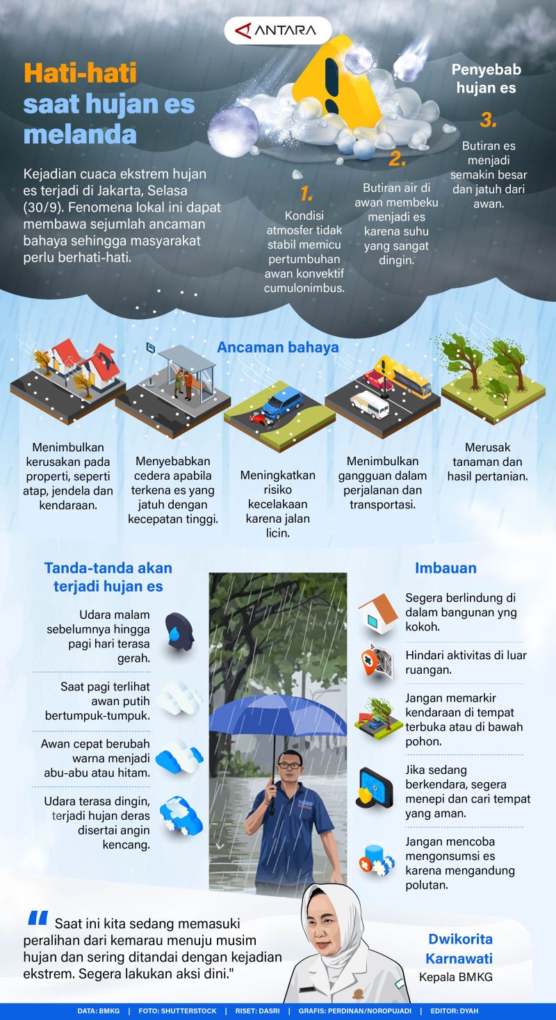 Kejadian cuaca ekstrem berupa hujan es terjadi di Jakarta, Selasa (30/9). Fenomena lokal ini dapat membawa sejumlah ancaman bahaya sehingga masyarakat perlu berhati-hati.