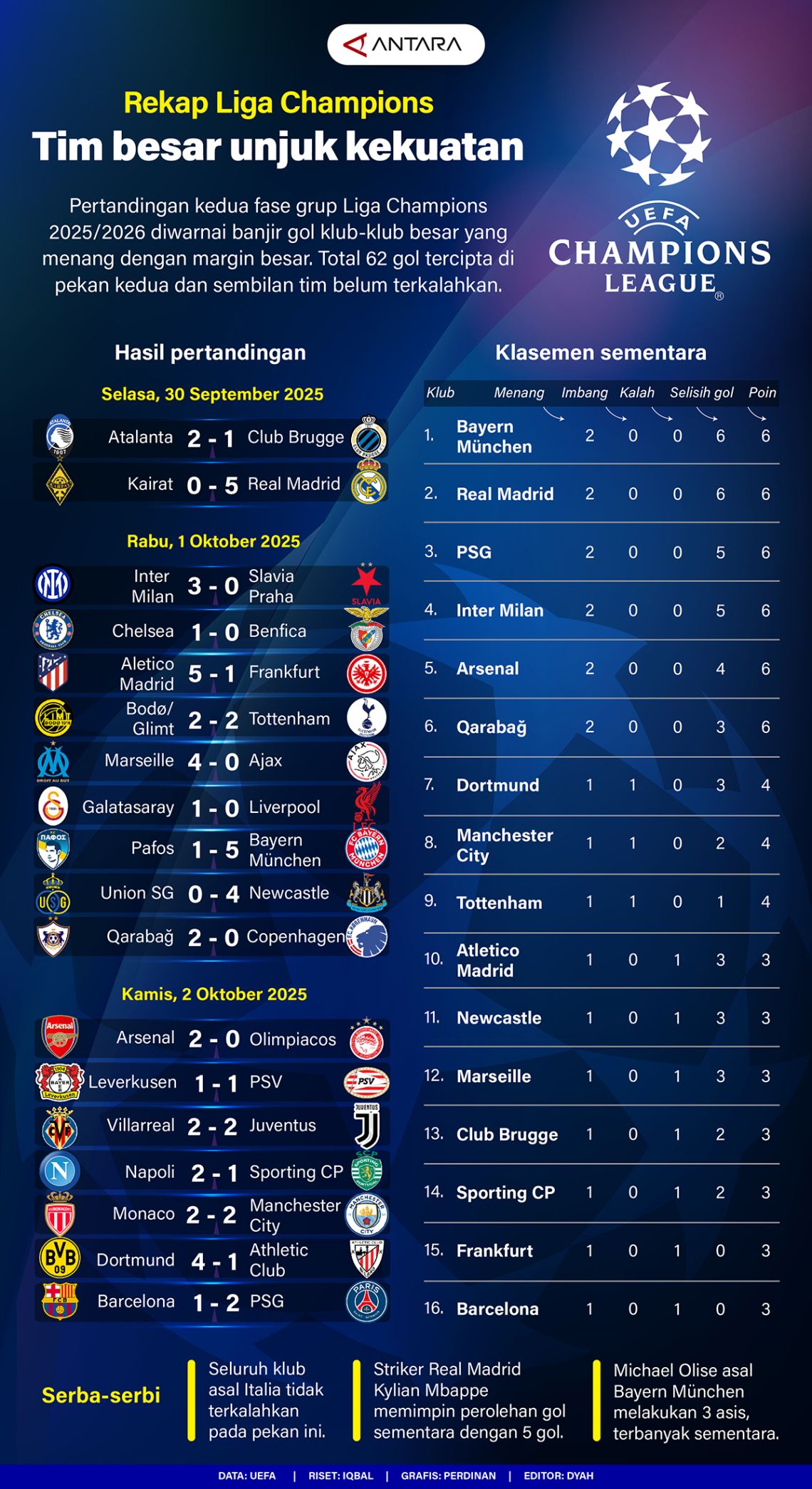 Pertandingan kedua fase grup Liga Champions 2025/2026 diwarnai banjir gol klub-klub besar yang menang dengan margin besar. Total 62 gol tercipta di pekan kedua dan sembilan tim belum terkalahkan.
