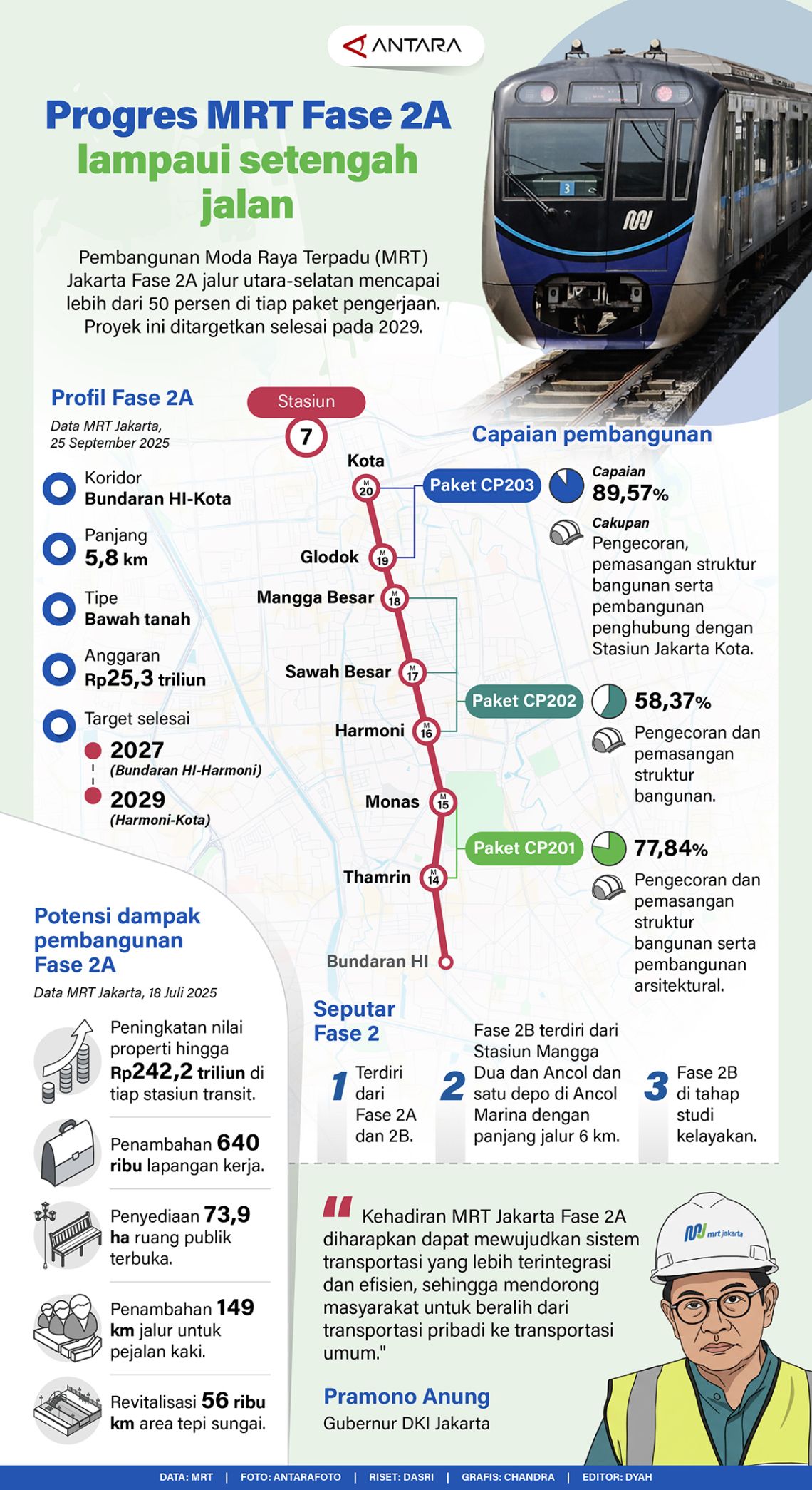 Pembangunan Moda Raya Terpadu (MRT) Jakarta Fase 2A jalur utara-selatan mencapai lebih dari 50 persen di tiap paket pengerjaan. Proyek ini ditargetkan selesai pada 2029.