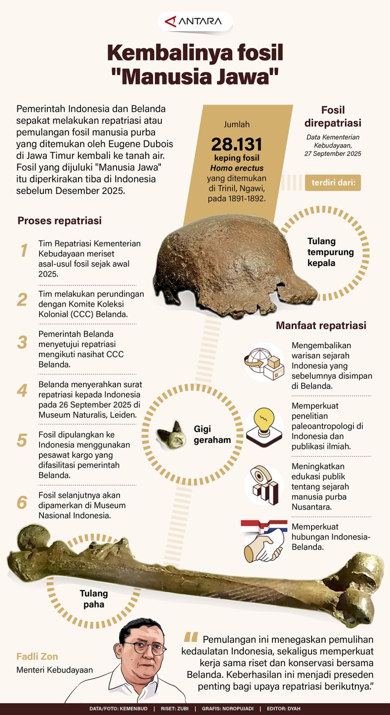 Pemerintah Indonesia dan Belanda sepakat melakukan repatriasi atau pemulangan fosil manusia purba yang ditemukan oleh Eugene Dubois di Jawa Timur kembali ke tanah air. Fosil yang dijuluki "Manusia Jawa" itu diperkirakan tiba di Indonesia sebelum Desember 2025.