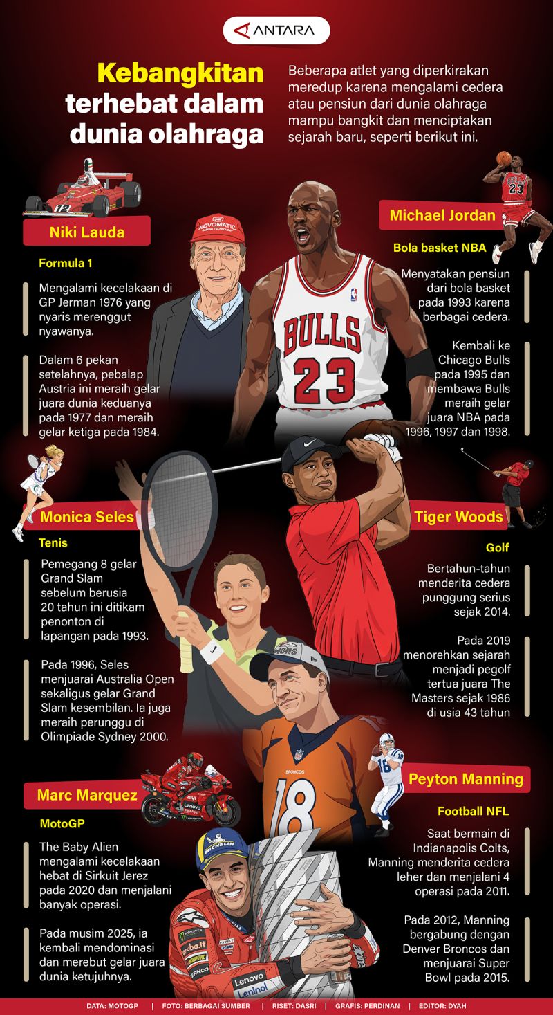 Beberapa atlet yang diperkirakan meredup karena mengalami cedera atau pensiun dari dunia olahraga mampu bangkit dan menciptakan sejarah baru, seperti berikut ini.
