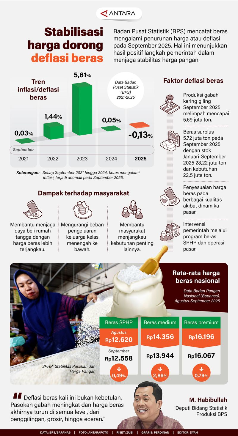 Badan Pusat Statistik (BPS) mencatat beras mengalami penurunan harga atau deflasi pada September 2025. Hal ini menunjukkan hasil positif langkah pemerintah dalam menjaga stabilitas harga pangan.