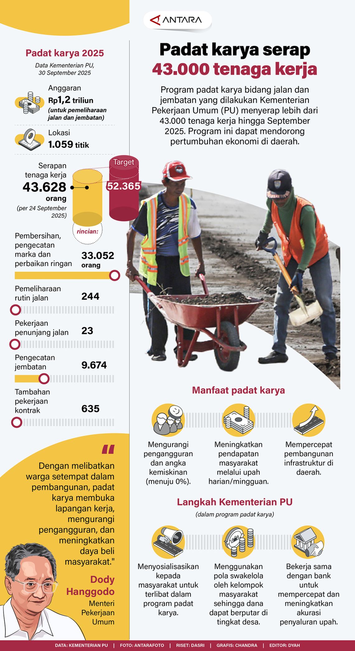 Program padat karya bidang jalan dan jembatan yang dilakukan Kementerian Pekerjaan Umum (PU) menyerap lebih dari 43.000 tenaga kerja hingga September 2025. Program ini dapat mendorong pertumbuhan ekonomi di daerah.