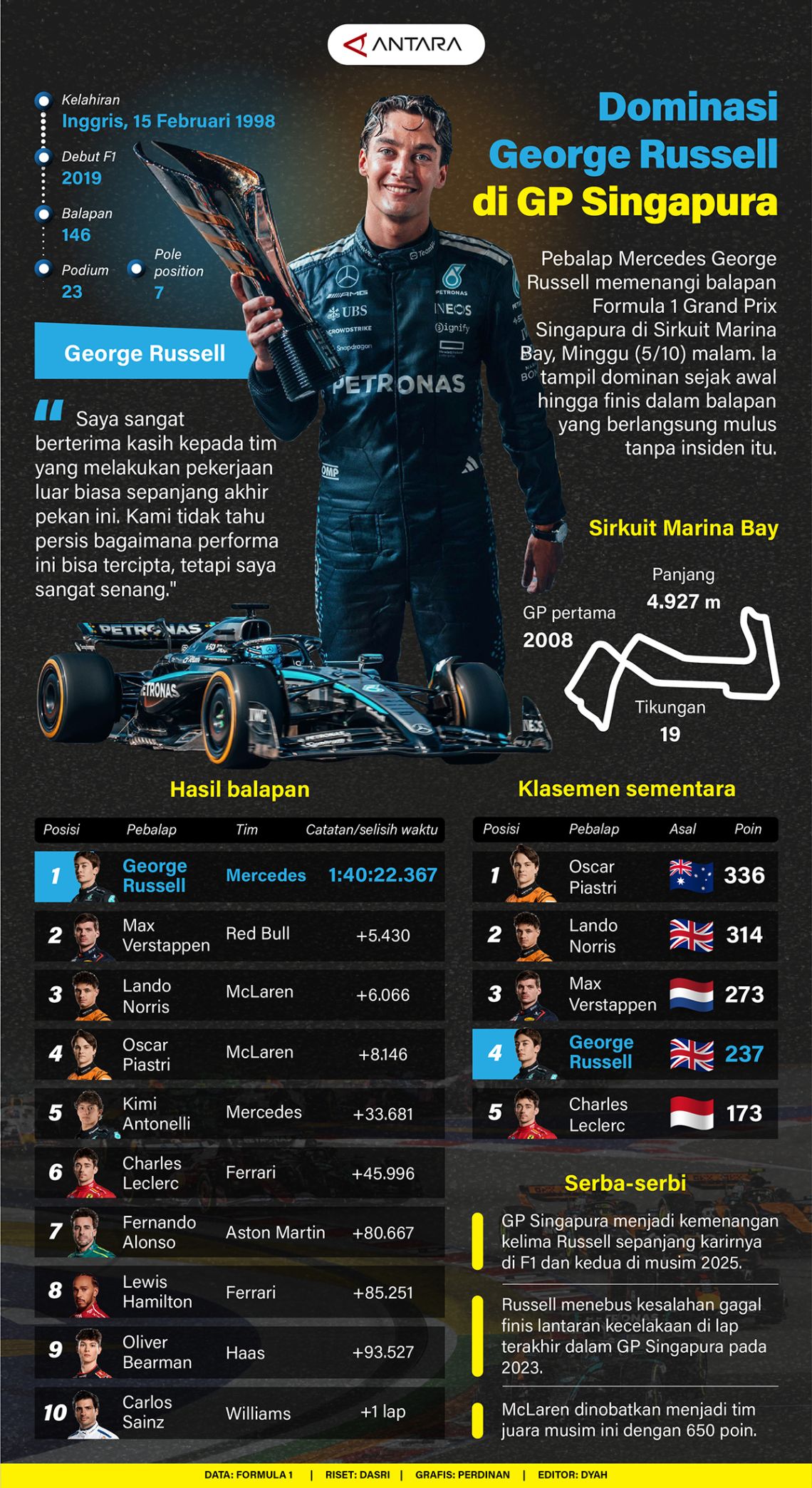 Pebalap Mercedes George Russell memenangi balapan Formula 1 Grand Prix Singapura di Sirkuit Marina Bay, Minggu (5/10) malam. Ia tampil dominan sejak awal hingga finis dalam balapan yang berlangsung mulus tanpa insiden itu.