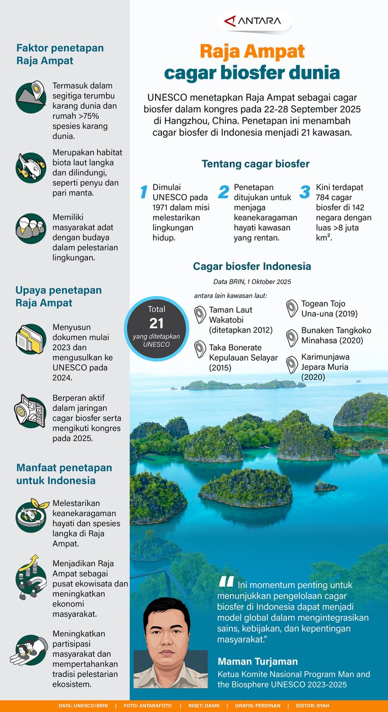 UNESCO menetapkan Raja Ampat sebagai cagar biosfer dalam kongres pada 22-28 September 2025 di Hangzhou, China. Penetapan ini menambah cagar biosfer di Indonesia menjadi 21 kawasan.