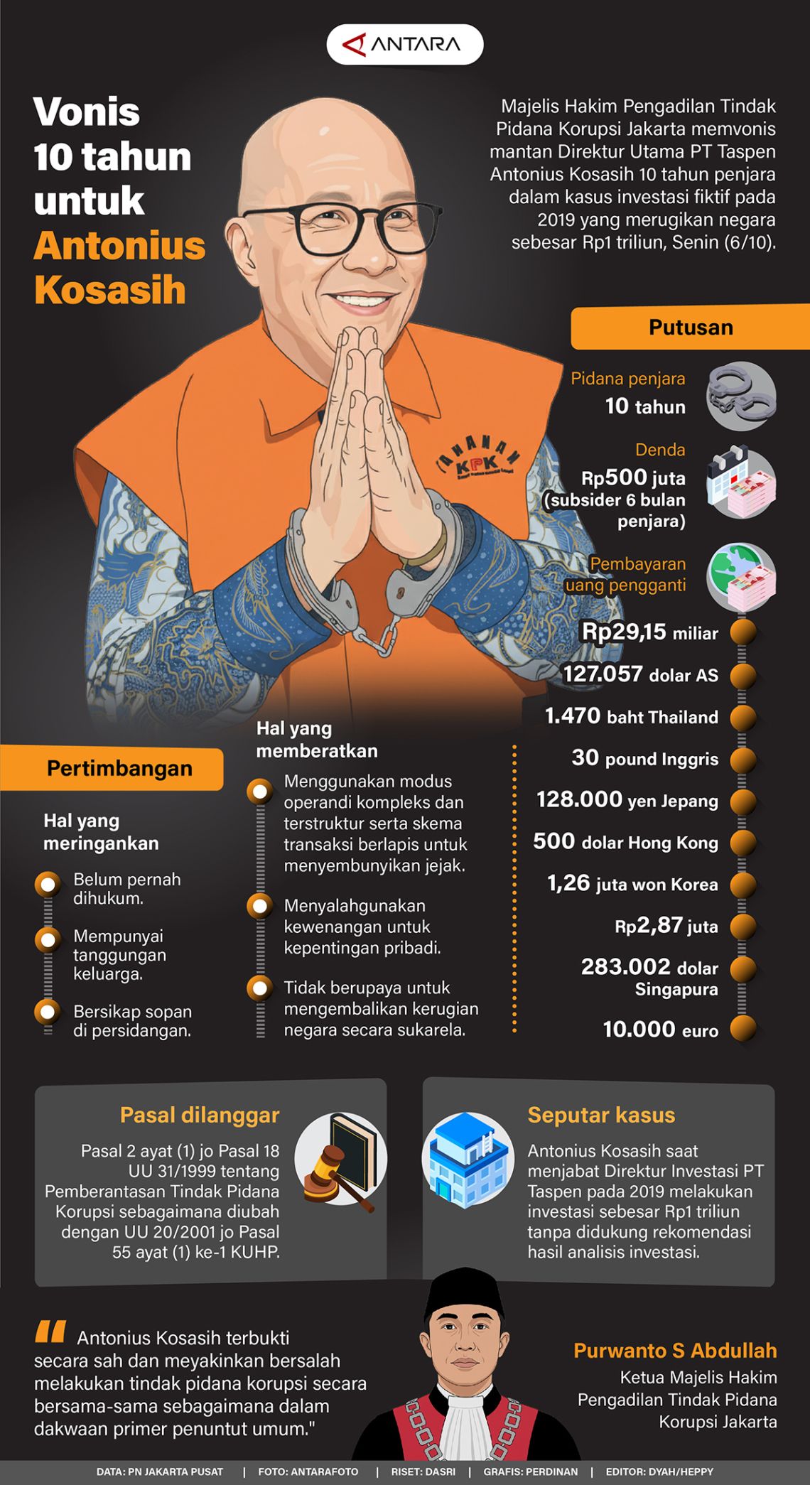 Majelis Hakim Pengadilan Tindak Pidana Korupsi Jakarta memvonis mantan Direktur Utama PT Taspen Antonius Kosasih 10 tahun penjara dalam kasus investasi fiktif pada 2019 yang merugikan negara sebesar Rp1 triliun, Senin (6/10).