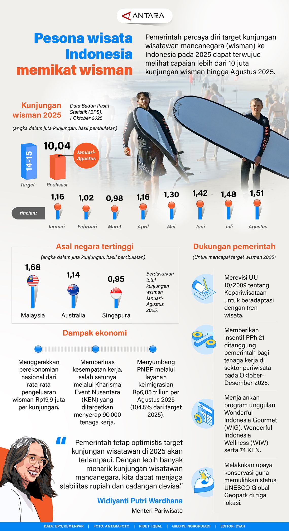 Pemerintah percaya diri target kunjungan wisatawan mancanegara (wisman) ke Indonesia pada 2025 tercapai melihat capaian pariwisata Indonesia yang memikat lebih dari 10 juta wisman hingga Agustus 2025.
