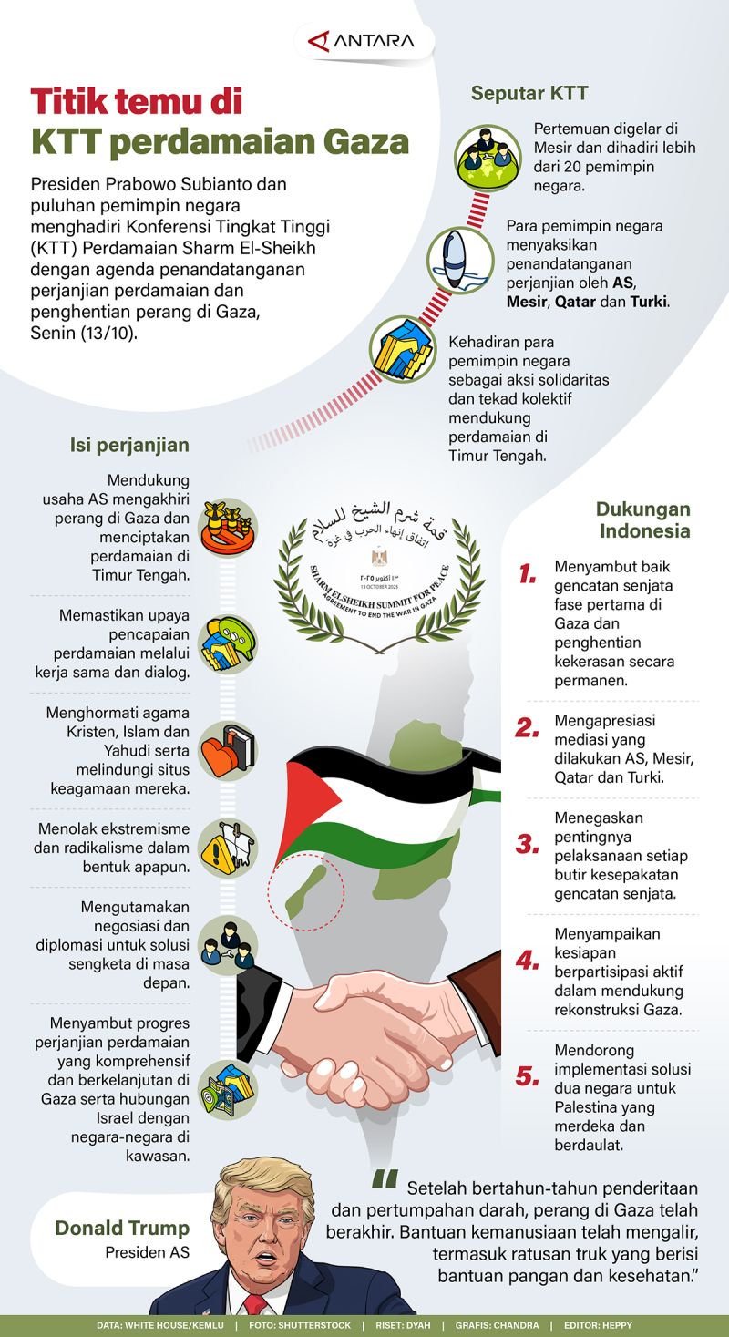 Presiden Prabowo Subianto dan puluhan para pemimpin negara menghadiri Konferensi Tingkat Tinggi (KTT) Perdamaian Sharm El-Sheikh dengan agenda penandatanganan perjanjian perdamaian dan penghentian perang di Gaza, Senin (13/10).
