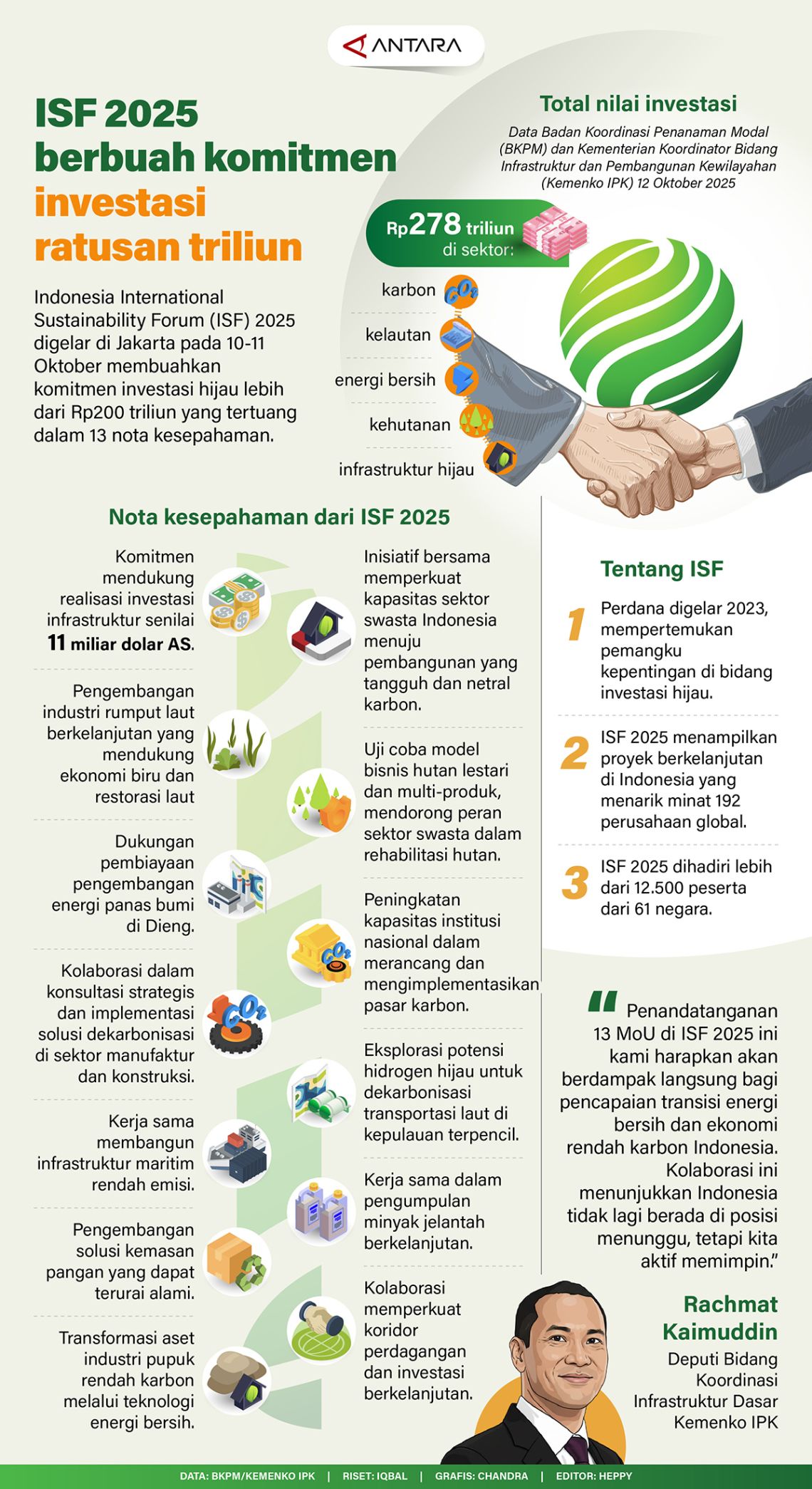 Indonesia International Sustainability Forum (ISF) 2025 digelar di Jakarta pada 10-11 Oktober membuahkan komitmen investasi hijau lebih dari Rp200 triliun yang tertuang dalam 13 nota kesepahaman.
