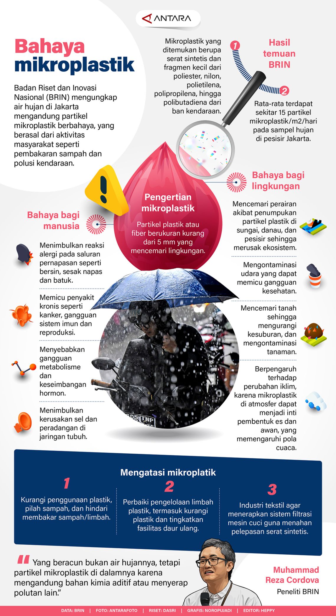 Badan Riset dan Inovasi Nasional (BRIN) mengungkap air hujan di Jakarta mengandung partikel mikroplastik berbahaya, yang berasal dari aktivitas masyarakat seperti pembakaran sampah dan polusi kendaraan.