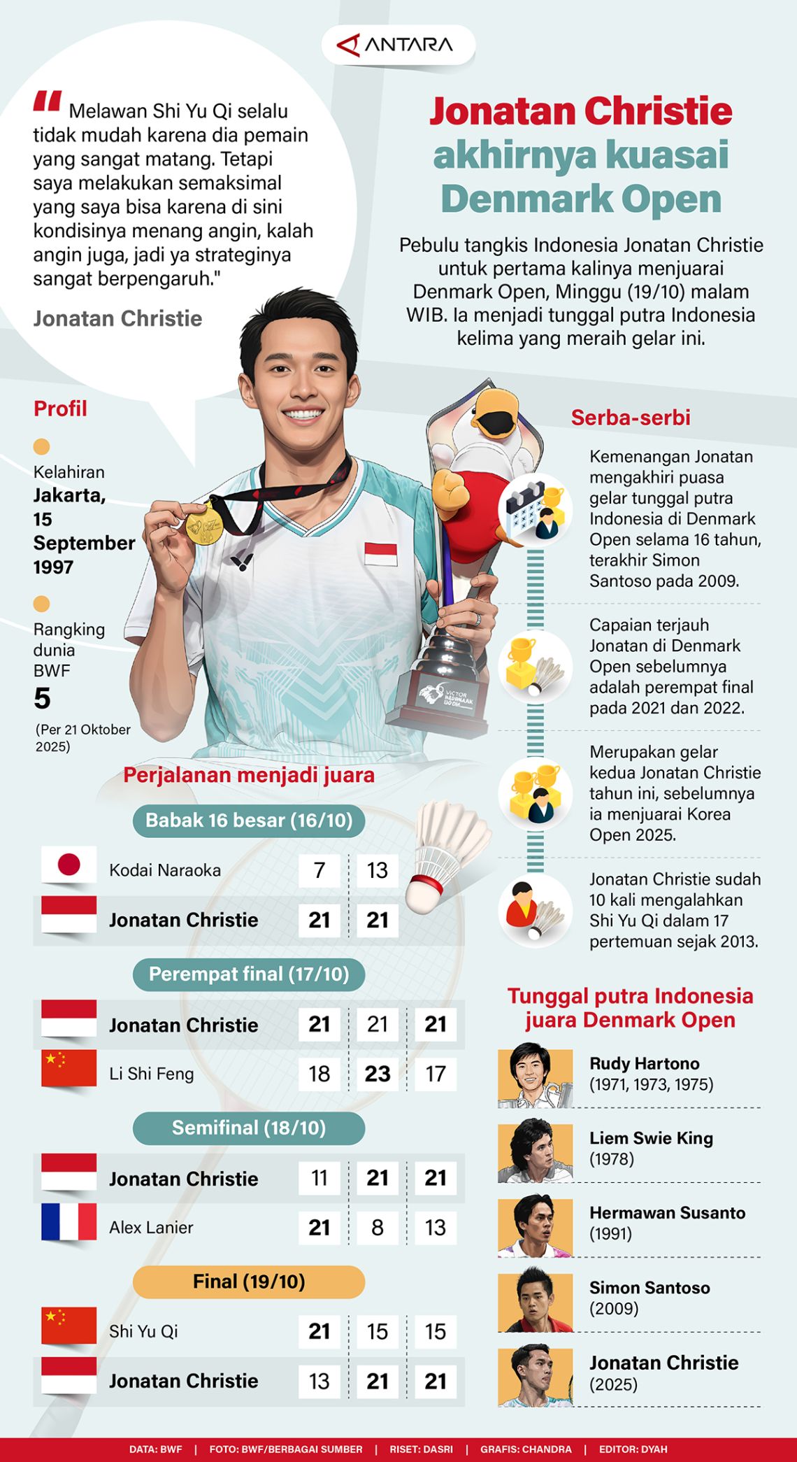 Pebulu tangkis Indonesia Jonatan Christie untuk pertama kalinya menjuarai Denmark Open, Minggu (19/10) malam WIB. Ia menjadi tunggal putra Indonesia kelima yang meraih gelar ini.