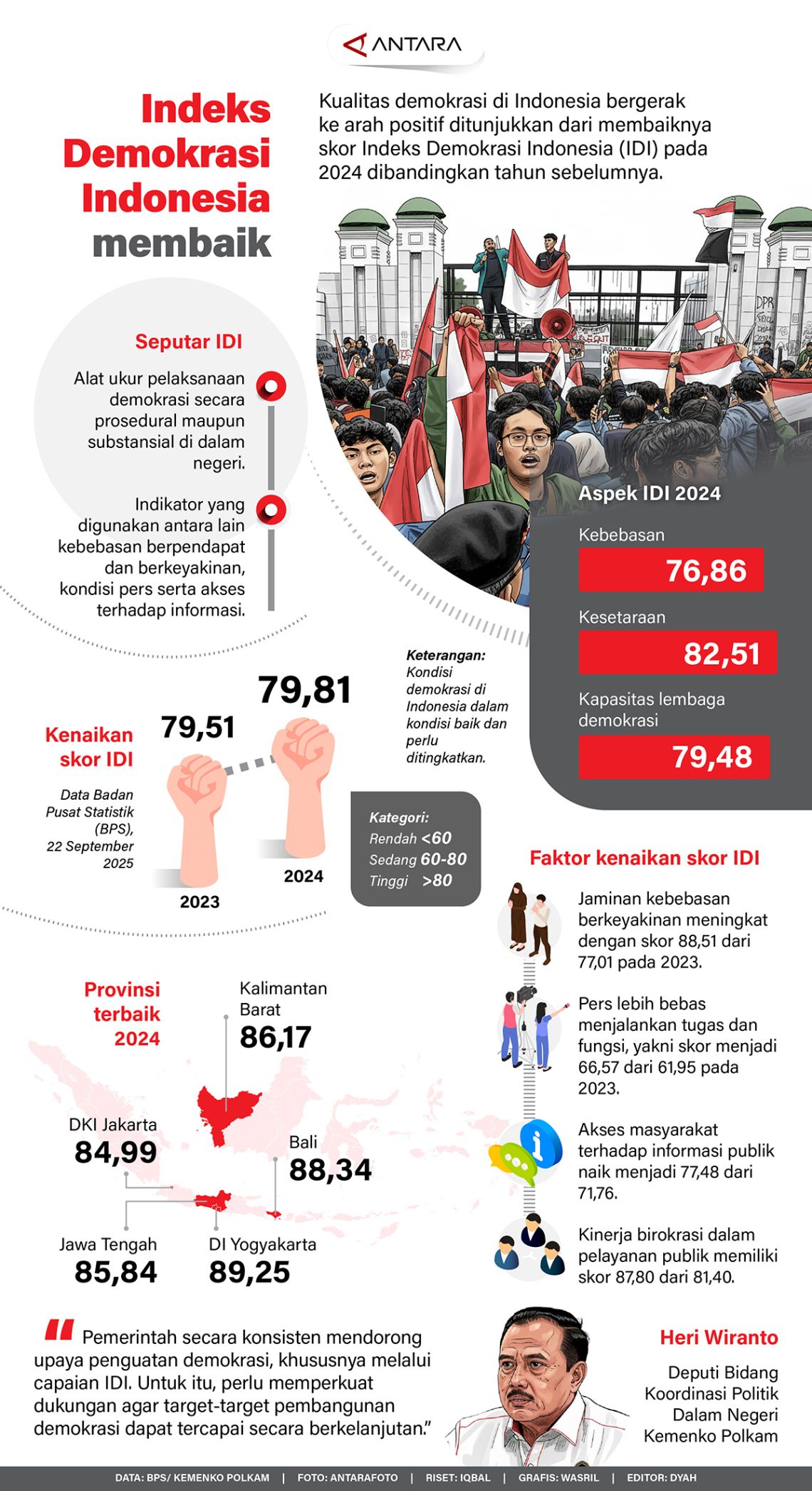 Kualitas demokrasi di Indonesia bergerak ke arah positif ditunjukkan dari membaiknya skor Indeks Demokrasi Indonesia (IDI) pada 2024 dibandingkan tahun sebelumnya.