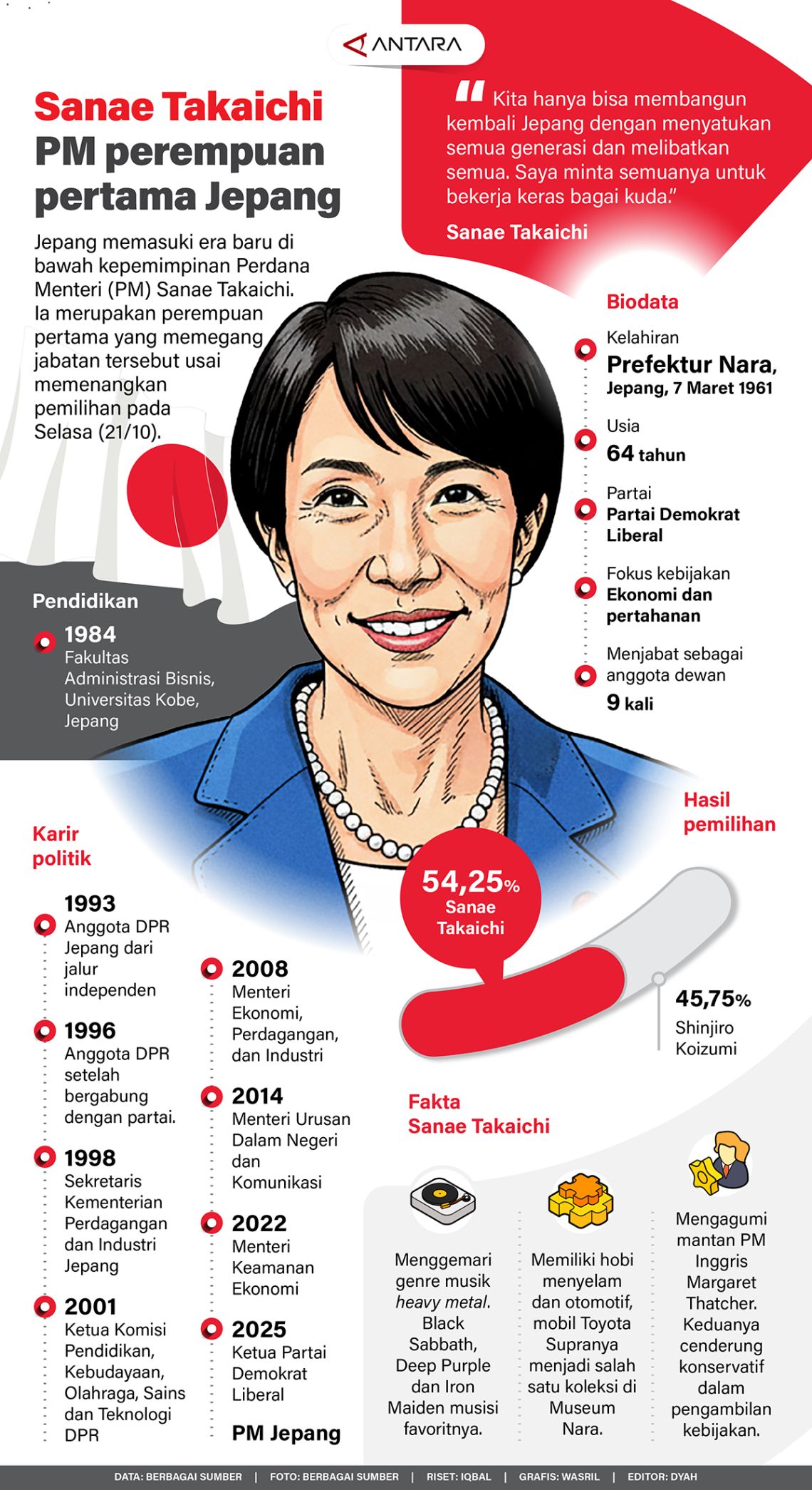 Jepang memasuki era baru di bawah kepemimpinan Perdana Menteri (PM) Sanae Takaichi. Ia merupakan perempuan pertama yang memegang jabatan tersebut usai memenangkan pemilihan pada Selasa (21/10).