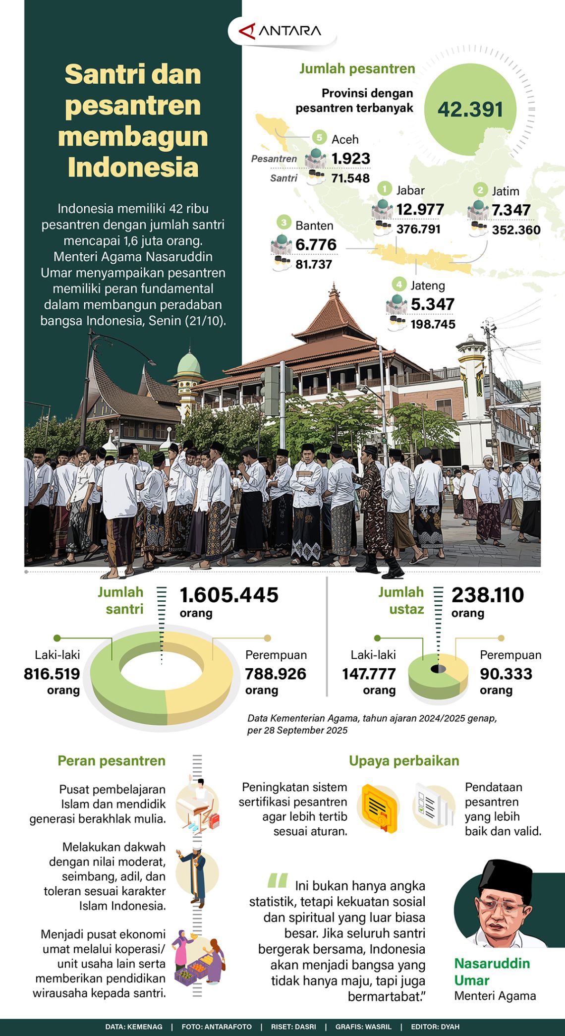 Indonesia memiliki 42 ribu pesantren dengan jumlah santri mencapai 1,6 juta orang. Menteri Agama Nasaruddin Umar menyampaikan pesantren memiliki peran fundamental dalam membangun peradaban bangsa Indonesia, Senin (21/10).
