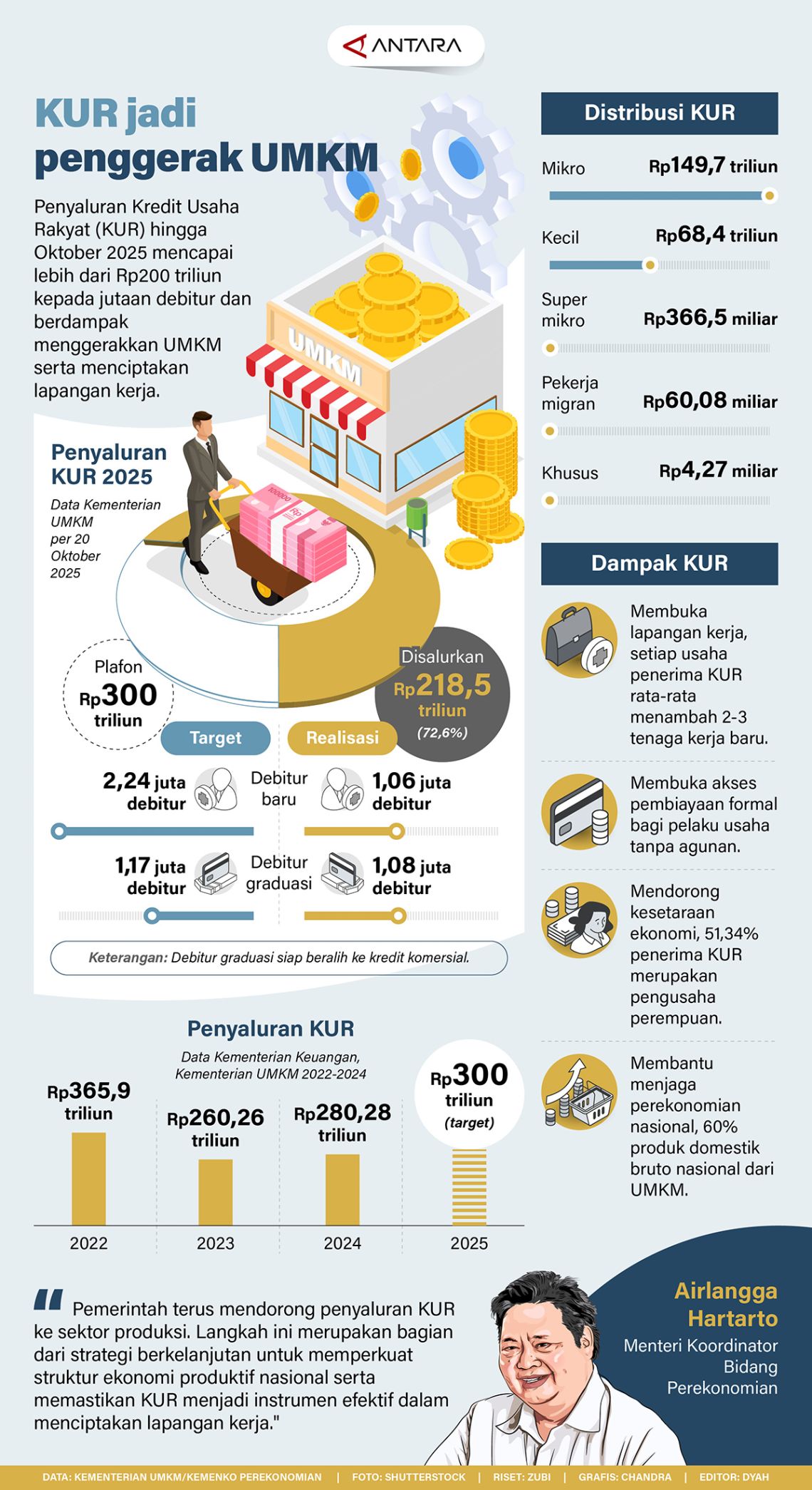 Penyaluran Kredit Usaha Rakyat (KUR) hingga Oktober 2025 mencapai lebih dari Rp200 triliun kepada jutaan debitur dan berdampak menggerakkan UMKM serta menciptakan lapangan kerja.