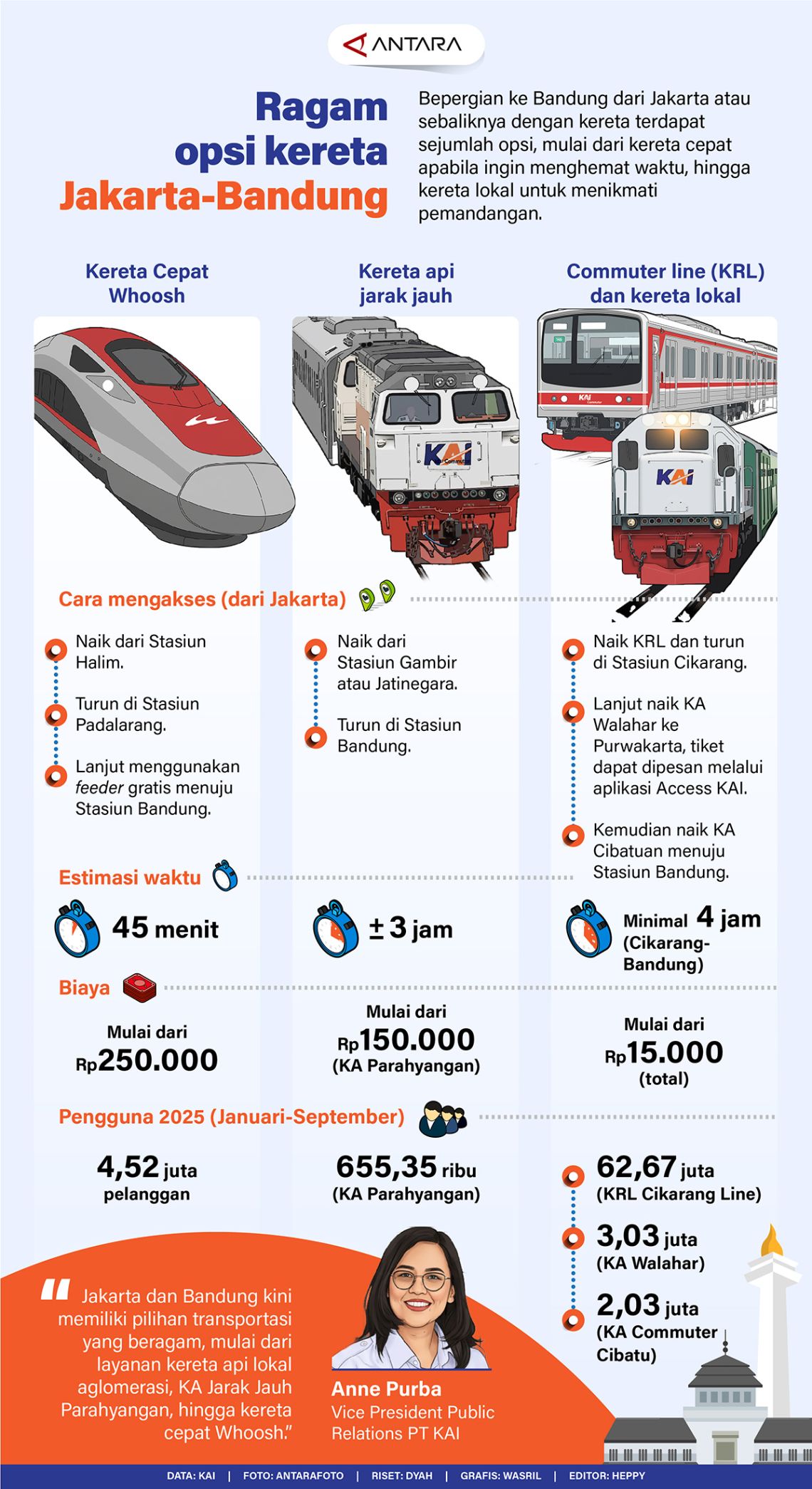 Bepergian ke Bandung dari Jakarta atau sebaliknya dengan kereta terdapat sejumlah opsi, mulai dari kereta cepat apabila ingin menghemat waktu, hingga kereta lokal untuk menikmati pemandangan.