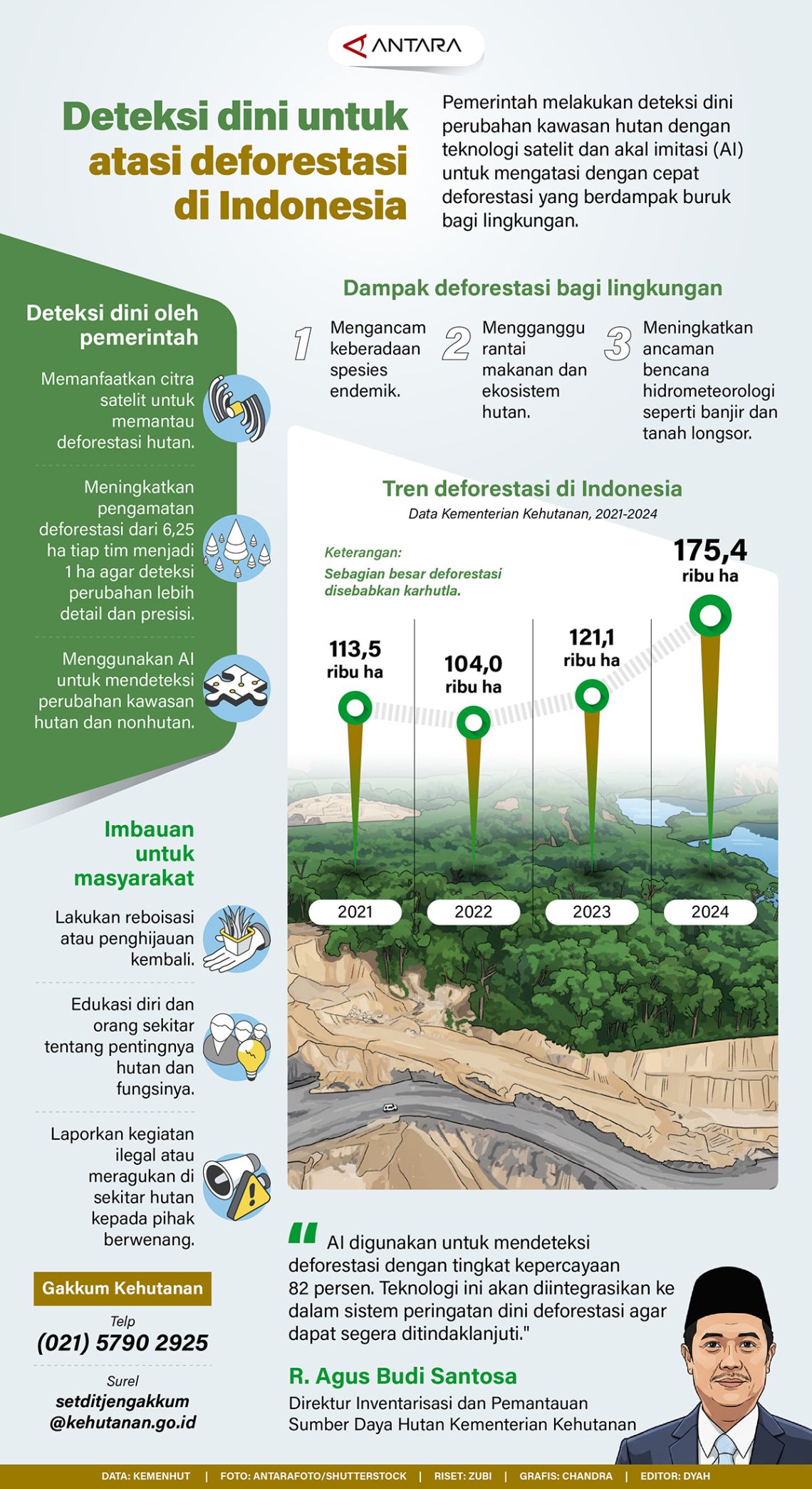 Pemerintah melakukan deteksi dini perubahan kawasan hutan dengan teknologi satelit dan akal imitasi (AI) untuk mengatasi dengan cepat deforestasi yang berdampak buruk bagi lingkungan.